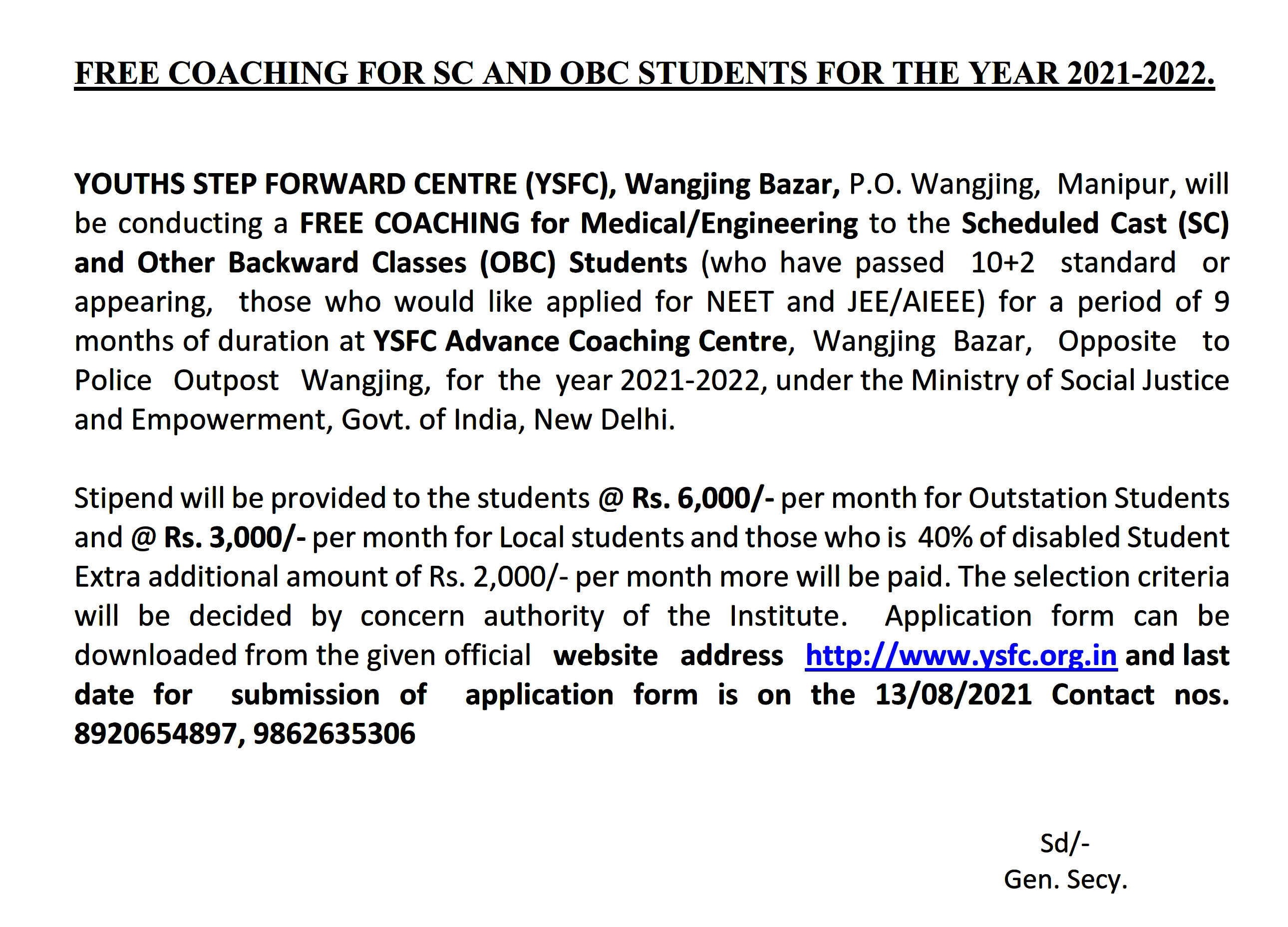 It is my pleasure that being a General Secretary of the organization Youths Step Forward Centre (YSFC), Wangjing Bazar, P.O. Wangjing, Manipur-795148, is a non-profit Non-Governmental Organisation, Registered under Manipur Societies Registration Act. 1989, (Act. 1 of 1990) working for the welfare of the people of our State Manipur since the last 20 years. We are implementing different types of Projects/Schemes for Rural Development from CAPART NE Zone Guwahati, under the Ministry of Rural Development, and from other Ministries like Social Justice and Empowerment and the Ministry of Environment and Forest, Government of India, New Delhi, supporting to poor beneficiaries living in the remotes areas of the entire State.