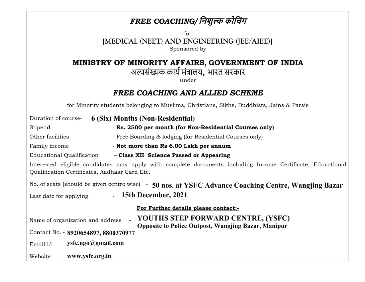 FREE COACHING (NEET AND JEE/AIEEE) FOR MINORITY STUDENTS